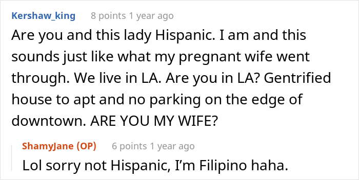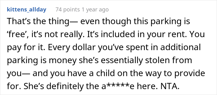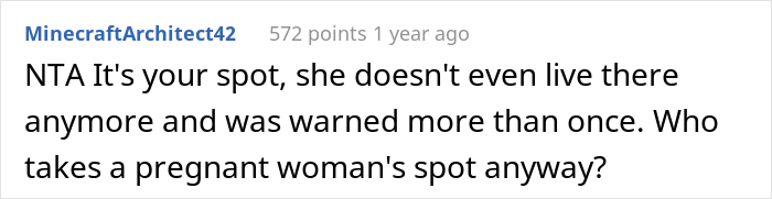 Parking disputes between neighbors are nothing new. When there are not specifically designated spots or one person does not respect the amount of space available for all residents, drama tends to ensue. However, in this particular situation, it should not even be up for discussion. The former neighbor no longer has any right to be parking at a building she does not live in. She was also kindly warned not to park there any longer. I can empathize with how expensive parking is, particularly in big cities or downtown areas, but she has to be reasonable. It is up to her and her employer to find a solution for her parking dilemma when she comes to work; it is not the responsibility of a pregnant former neighbor who is just trying to peacefully live her life and have somewhere to park when she gets home.