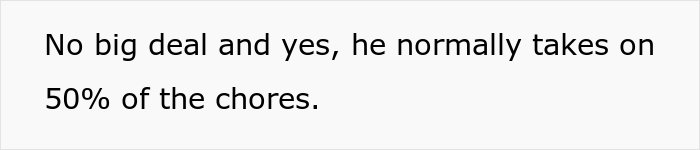 Speaking of the situation in question, the fact that the household chores are generally shared equally sounds positive. But Head argued that when her husband refused to acknowledge that the house was left clean and now is a mess, and then complained that it wasn’t that bad — it shows a lack of maturity. “Then saying that with their agreement, she should now help with her 50% to clean it up is not taking responsibility. Her 50% entailed leaving the house clean in the first place and even precooking meals for him!”
